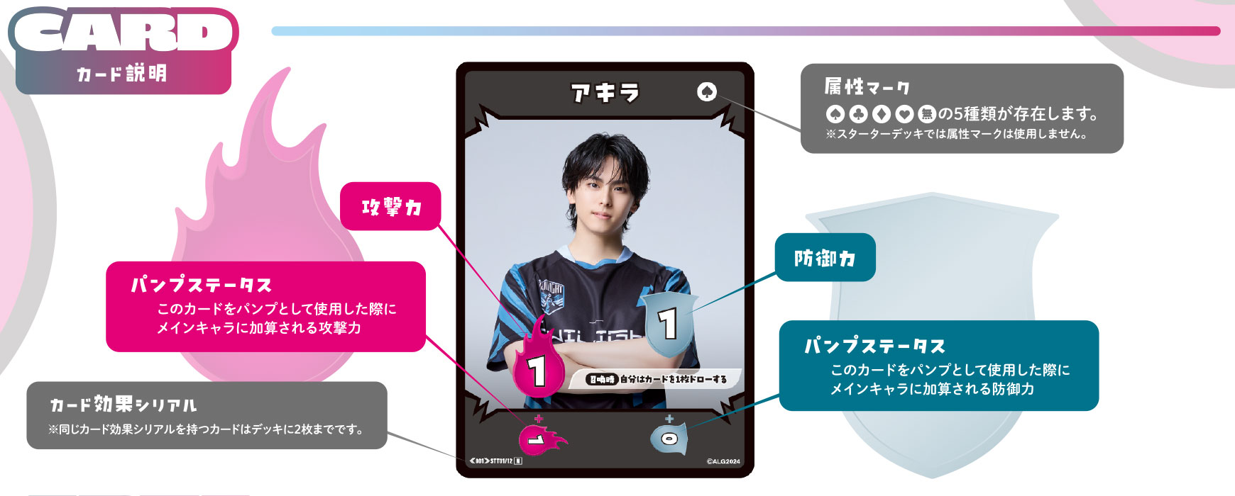 各キャラの攻撃力、防御力、パンプステータスを駆使して戦うカード。 キャラにキャラを重ねてパンプ召喚することで、最強の攻撃力や防御力を発揮することができる。
